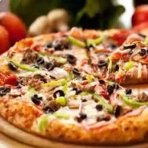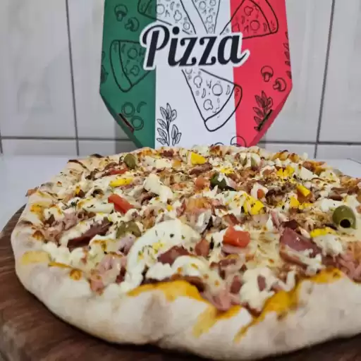 Molho especial, mozzarella, orégano, azeitona, tomate, presunto, milho e catupiry.